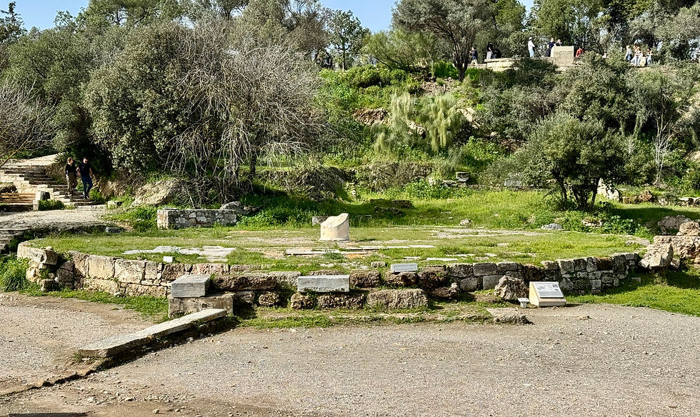 The field here in front with the multiple rocky debris used to be an open grassy field. When the Romans occupied Athens in 156 BCE they built a theatre here. Before this elaborate set up, which should seat over 1000, plays by Aeschylus, Sophocles, and Euripides were performed here regularly out in the open. It was the birthplace of modern theatre.