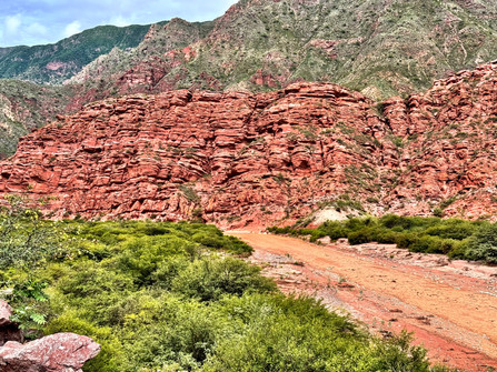 As we drove south we left the subtropical Salta region and entered rolling hills with red sedimentary sandstone rock scars. The last large rain had washed out several roads, but our route was secure. About an hour before reaching Cafayate we reached the mouth of the Quebrada canyon.