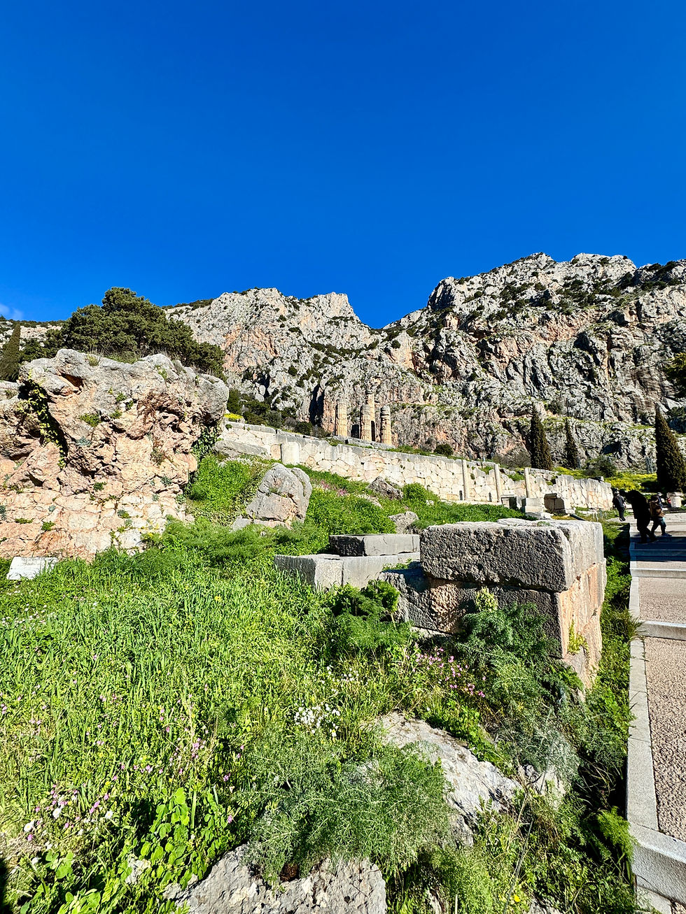 Eventually you made it here to the courtyard before the great Temple of Apollo. in its time it was gleaming white. Behind you stood an enormous statue of the the god. This temple was actually the third and largest built on this site.